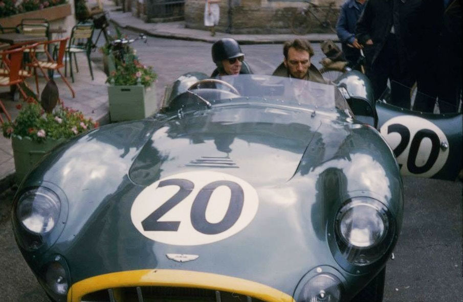 Le Mans, 1957. Tony Brooks parked outside the Aston Martin base, the Hotel de France, in a DBR1.