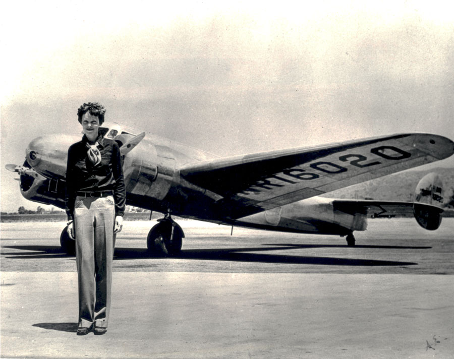 Amelia Earhart standing in front of the Lockheed Electra in which she disappeared in.