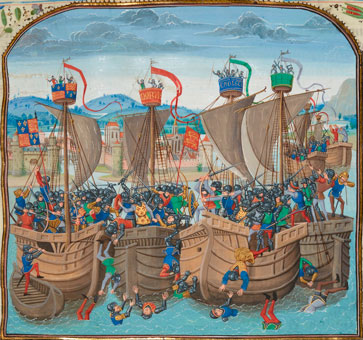 The English approached in three lines, with the largest ships to the front, including Edward III’s own flagship, the cog Thomas. Height was an advantage, and the English had the manpower to exploit it to its fullest – a large army of men-at-arms and archers intended for the land army.