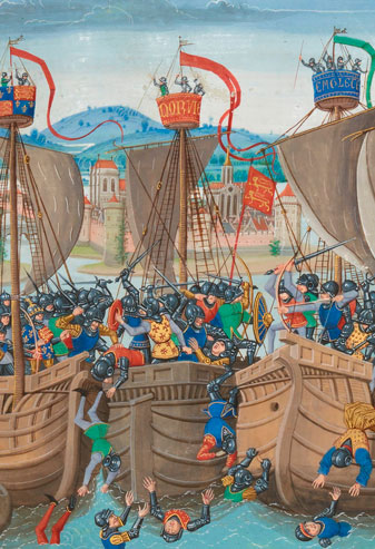 The French held a 3 line position across the mouth of the Zwin Estuary, ships and galleys were tied together with cables, unable to manoeuvre, waiting for the English to attack. But Edward didn't advance immediately, he waited. Then just before engaging, his ships veered away, feigning flight. Several French ships in the front line broke rank to give chase. With the advantage of tide and the blinding sun, Edward's ships turned and a murderous and bloody battle began. The French fleet was virtually destroyed, they lost 190 ships and 16-18,000 men, including both admirals. It was one of the most crushing victories in naval history.