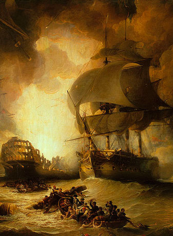 Nelson found the French fleet napping in Aboukir Bay. At dusk, with the advantage of wind, his fleet rushed on the opposition. Chaos ensued. The French flagship, L'Orient, exploded at the height of battle, pelting all around with body parts, timber and debris. The French were annihilated. In the carnage, 11 ships and 2 frigates were taken and up to 5,225 Frenchmen died and 3,105 captured, including wounded. British lost no ships and casualties totalled 895.