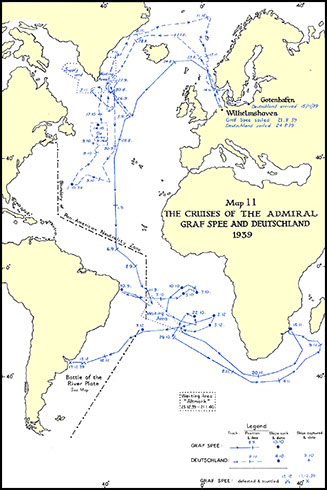 Tricked by British reports, Captain Langsdorff believed he faced annihilation against a superior force beyond the horizon and defied Hitler's order to fight to the last man. He ordered the scuttling of his ship and 3 days later committed suicide, lying on Graf Spee's battle ensign.