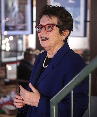 Billie Jean King speaking at an event in Iowa, 2016