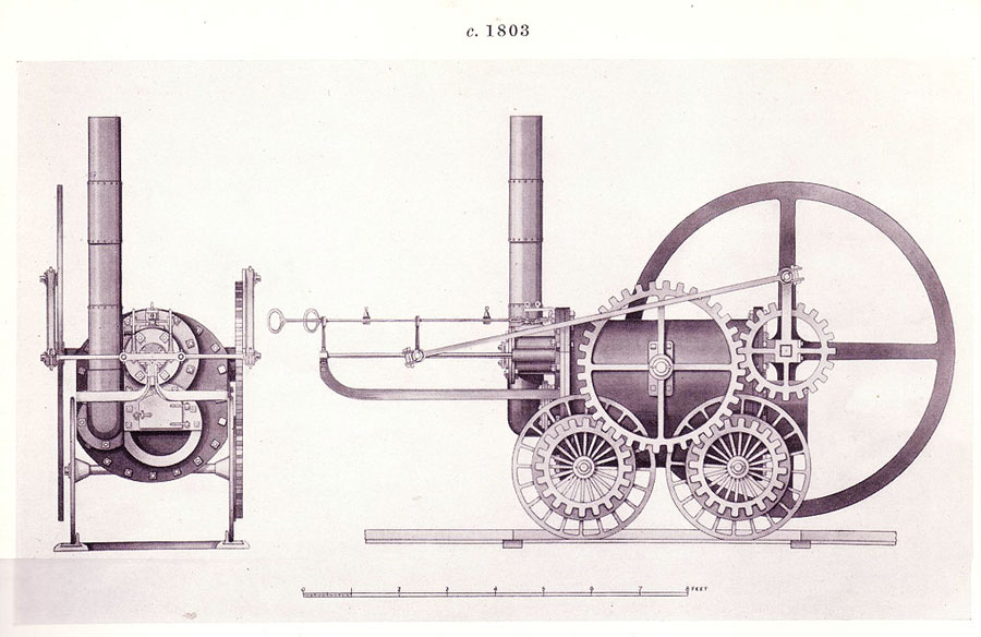 The Coalbrookdale company then built a rail locomotive for Trevithick, but little is known about it, including whether or not it actually ran. To date, the only known information about it comes from a drawing preserved at the Science Museum, London, together with a letter written by Trevithick to his friend, Davies Giddy. The design incorporated a single horizontal cylinder enclosed in a return-flue boiler. A flywheel drove the wheels on one side through spur gears, and the axles were mounted directly on the boiler, with no frame. On the drawing, the piston-rod, guide-bars and cross-head are located directly above the firebox door, thus making the engine extremely dangerous to fire while moving. This is the drawing used as the basis of all images and replicas of the later
