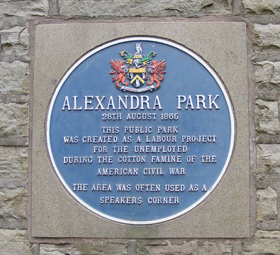 A blue plaque in Oldham's Alexandra Park, commemorating its origins.