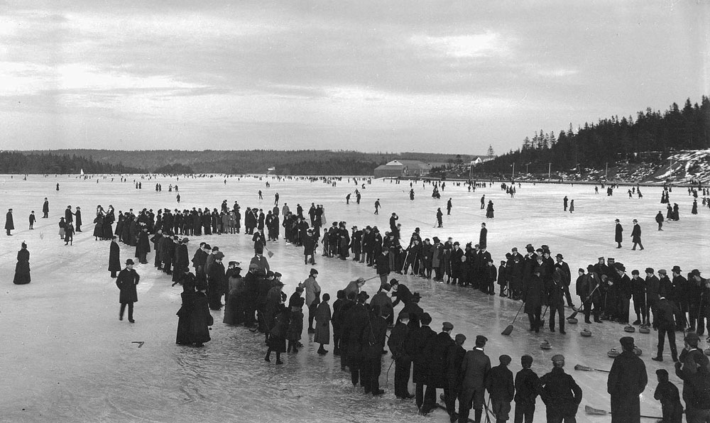 People curling on a lake in Dartmouth, Nova Scotia, Canada, circa 1897.