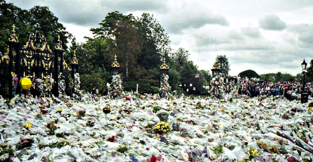 Tributes left outside Kensington Palace after the death of Diana, Princess of Wales on 31 Aug 1997