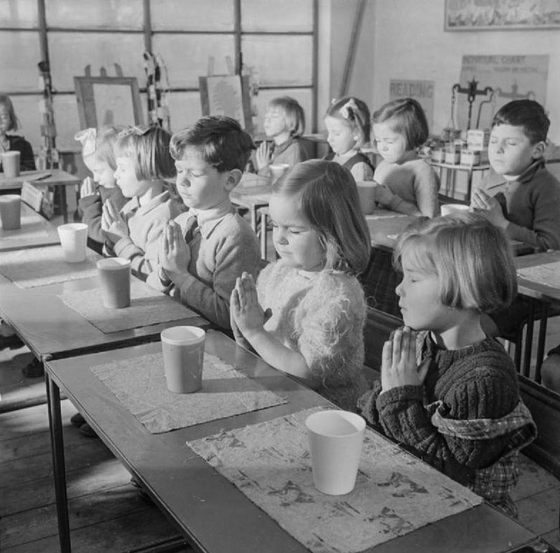 mid-morning milk. They are all sitting with their hands together and their eyes closed to pray.