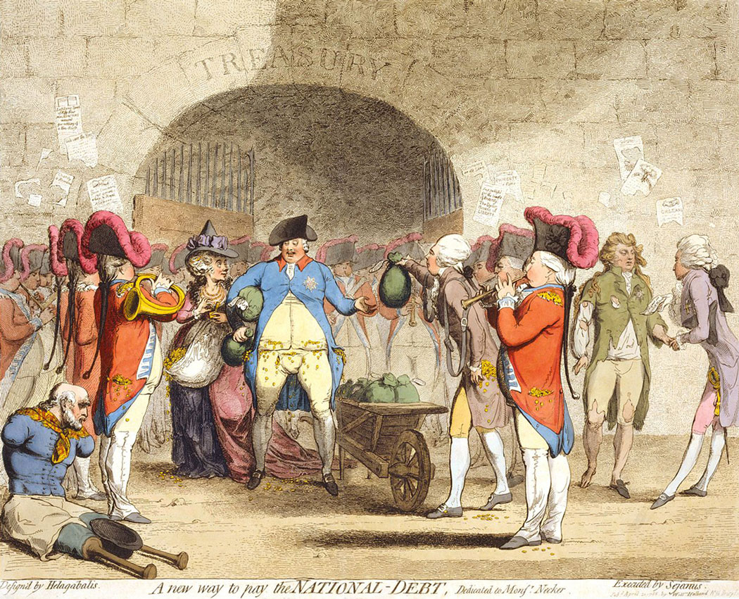 Cartoon shows King George III and Queen Charlotte standing before the Treasury, moneybags under their arms, their pockets overflowing and bursting with coins (funds from the Treasury to cover Royal debts), William Pitt, his pockets full of coins, hands the king another moneybag taken from an overflowing wheelbarrow; the Prince of Wales (the future George IV) stands to the right looking destitute; a quad-amputee sits on the ground to the left with an overturned and empty hat between the stubs of his legs, which are fitted with wooden prostheses.