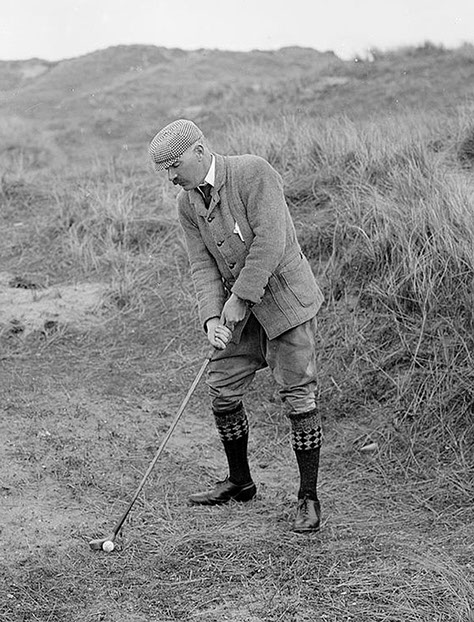 Impeccably clad Dr P. Gallwey playing golf at Tramore, Waterford, Ireland. Don't know whether he's in the rough, or whether Tramore Golf Club just wasn't as manicured as we're used to nowadays!
