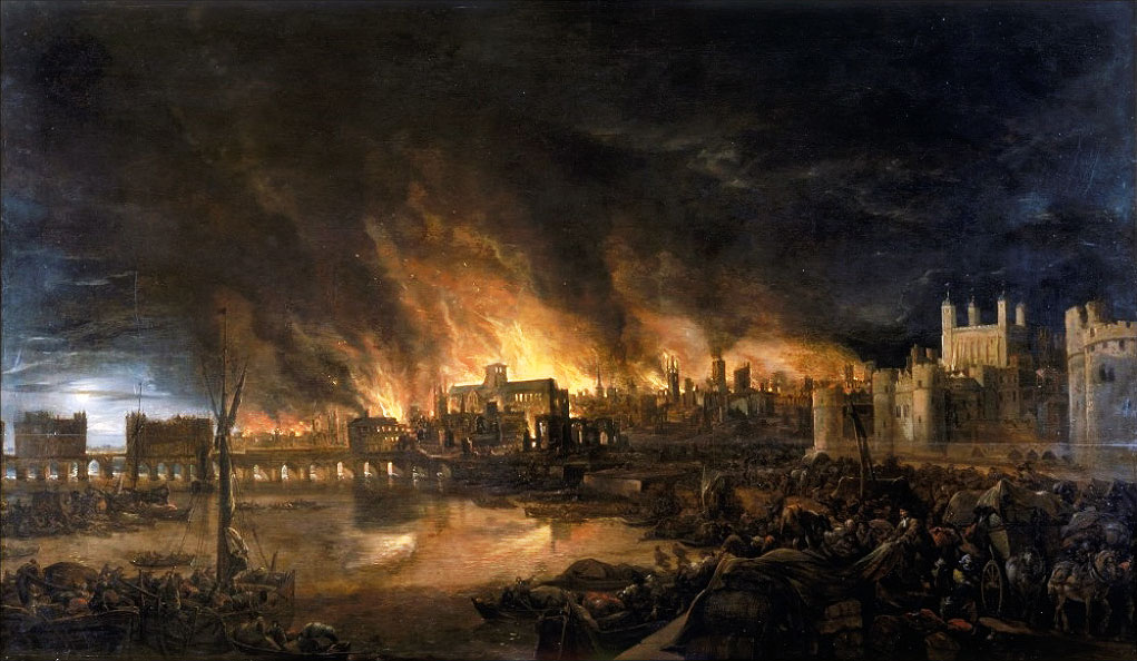 This painting shows the great fire of London as seen from a boat in vicinity of Tower Wharf. The painting depicts Old London Bridge, various houses, a drawbridge and wooden parapet, the churches of St Dunstan-in-the-West and St Bride's, All Hallow's the Great, Old St Paul's, St Magnus the Martyr, St Lawrence Pountney, St Mary-le-Bow, St Dunstan-in-the East and Tower of London. The painting is in the style of the Dutch School but is not dated or signed.