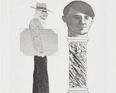 In this work, Hockney approaches Picasso in the manner of a student carrying his portfolio for inspection, represented as a giant sculptured head on a column.
