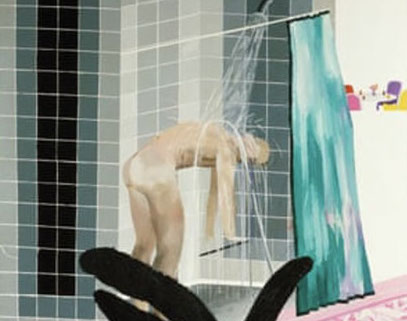 This painting includes some of the artist’s favourite themes: moving water, the curtain, domestic scenes and homoerotic imagery. The curtain motif (in particular, its flatness and similarities to a painting) had interested Hockney for several years. The source for the figure is a photograph taken by the Athletic Model Guild, which specialised in male nudes; the figure also has similarities to several images in Physique Pictorial. Hockney had intended from the beginning to add the foreground plant but, having difficulty with the feet, he bent the leaves to cover them. He began painting in acrylic during this first visit to Los Angeles, when colour rather than texture was his main concern.