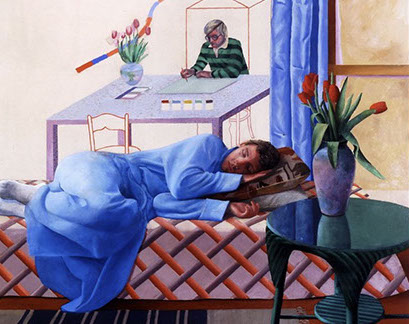 Hockney's self- portrait, which was not finished at the time, was leaning against the wall of his London studio. Gregory, his boyfriend, posed on a bed in front of it and great deal of his figure was painted from life. That gave a kind of power. It looks as though it's a painting of two completely different kinds of space. It seems as if there's a stage behind Gregory with a curtain. The curtain has been pulled back and there is Hockney, about to draw a guitar.
