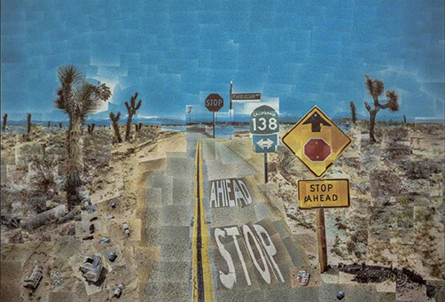 This is a painting of the notorious route 138, Antelope Valley, from both a driver's and passenger 's perspective. The composition also plays on perspective by way of the enlargement of nearer objects. This technique further emphasises the differing standpoints involved.