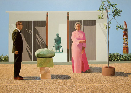 In the painting, Fred and Marcia look unhappy. Hockney sets them among their sculptures, standing apart and looking in different directors. Fred clenches a fist so fiercely he appears to be dripping paint; Marcia grins, her mouth mirroring that of the totem on the grass behind her. By choosing to have them mirror the pieces, the artist may be displaying their dedication to their purpose. The painting is a tease of textures and patterns, set against a depthless sky. By all accounts Marcia was not happy with the portrait.