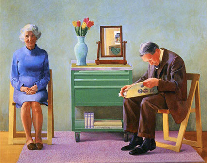 Hockey completed this work after two failed attempts at painting his parents, Kenneth and Laura Hockney. They were frustrated when Hockney gave up on previous versions, having spent hours posing for him. However, speaking about their reaction to My Parents, Hockney’s sister Margaret said, ‘Mum and Dad were very proud of it, and felt all the sittings had been worthwhile’. Kenneth and Laura’s poses may reflect their personalities. Laura is gazing directly at the viewer. Kenneth, known for fidgeting during sittings, is shown reading, as though he has forgotten he is being observed.