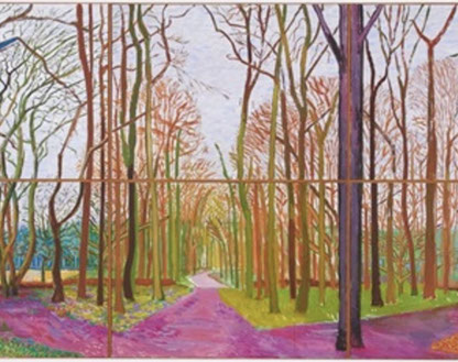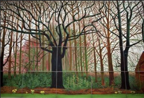 Early in the year, at a John Constable retrospective at the Tate Britain, Hockney is impresses by the scale of the British master's oil sketches. Upon returning to Bridlington, he explores painting the East Yorkshire landscape en plein air in oil. Having done many single canvas works, he turns his attention to a more expansive scale, which he achieves by combining canvases to depict a single scene across a grid of two, four or six canvases.