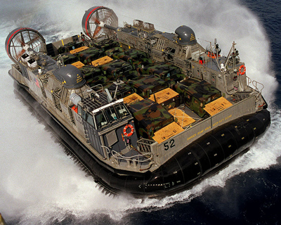 A Hovercraft use blowers to produce a large volume of air below the hull that produces lift, which causes the hull to float above the water