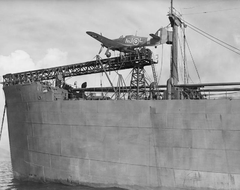 The Royal Navy during the Second World War A Hawker Sea Hurricane Mk IA on the catapult of a CAM (Catapult Armed Merchant) Ship at Greenock.