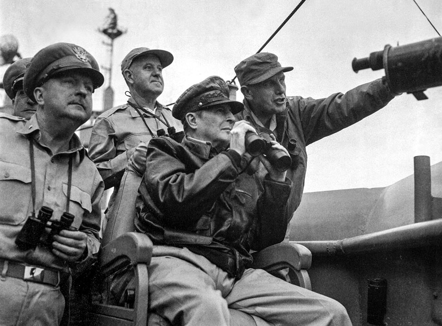General Douglas MacArthur, UN Command CiC (seated), observes the naval