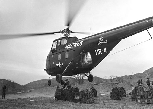 U.S. Marines hook up a cargo net on a Sikorsky HRS-2 helicopter, Korea 1953