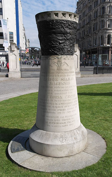 Magennis has had several memorials in his honour. Initial official recognition was only a photograph in the robing room of the Belfast city council chamber. The first memorial was erected in 1999 after a long campaign by his biographer George Fleming and Major S.H. Pollock CD (Canada). It, an elegant bronze and stone statue created by sculptor Elizabeth McLaughlin, was unveiled in Belfast on 8 October 1999. The ceremony was conducted in the grounds of Belfast City Hall in the presence of Magennis's son Paul, by the Lord Mayor of Belfast, Bob Stoker.