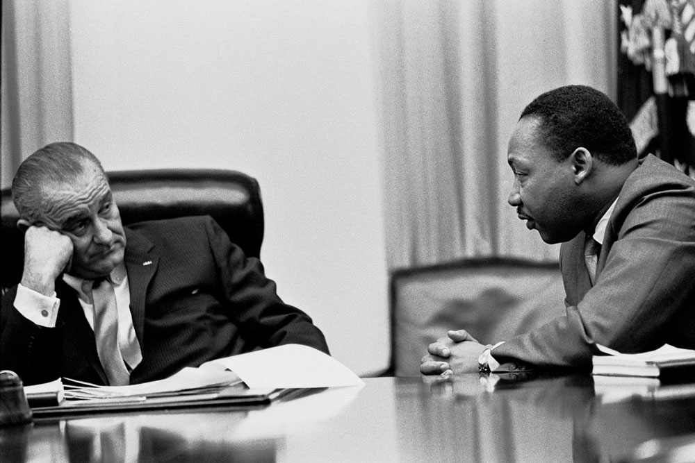 President Lyndon B. Johnson meets with Martin Luther King, Jr. in the White House Cabinet Room.
