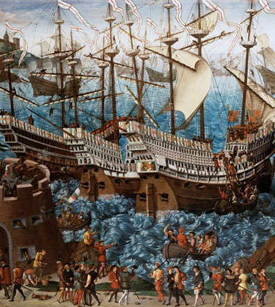 The Embarkation of Henry VIII at Dover, a painting that commemorated King Henry's voyage to the Field of the Cloth of Gold in 1520, painted in 1540. The vessels in the painting are shown decorated with wooden panels similar to those that would have been used on the Mary Rose on special occasions.