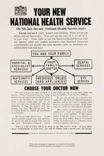 The NHS began on 5 July 1948. it was the climax of a hugely ambitious plan to bring good healthcare to all. For the first time, hospitals, doctors, nurses, pharmacists, opticians and dentists were brought together under one umbrella organisation to provide services that are free for all at the point of delivery.