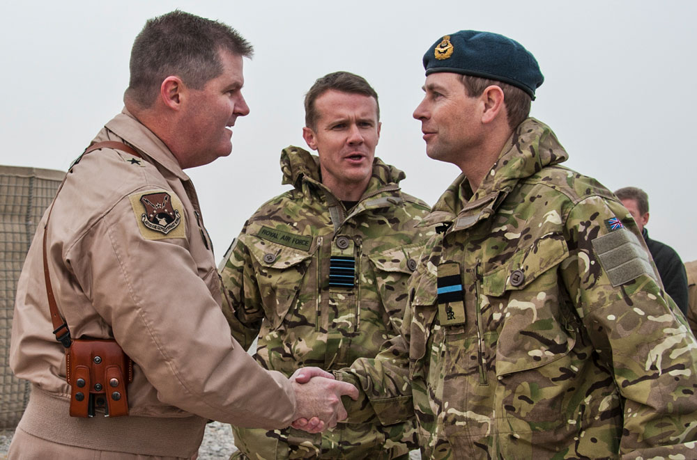 Prince Edward, right, shakes hands with U.S. Air Force Brig. Gen. Thomas Deale, the commander of the
