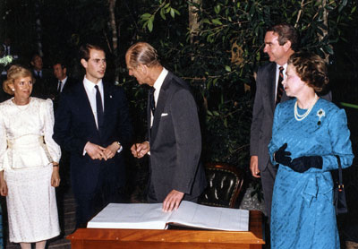 Her Majesty Queen Elizabeth II, HRH The Duke of Edinburgh and HRH Prince Edward signing guest book at Expo 88, Brisbane,1988