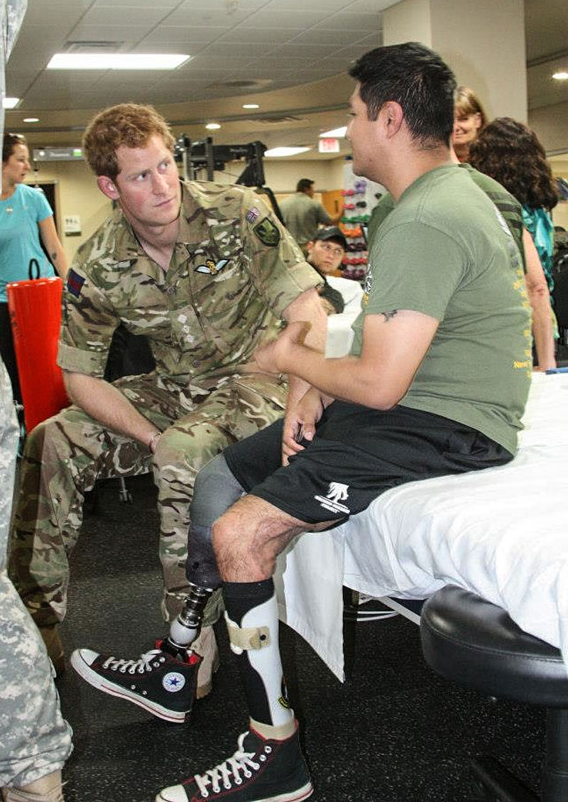Prince Harry talking to an injured soldier at the Walter Reed National Military Medical Center,