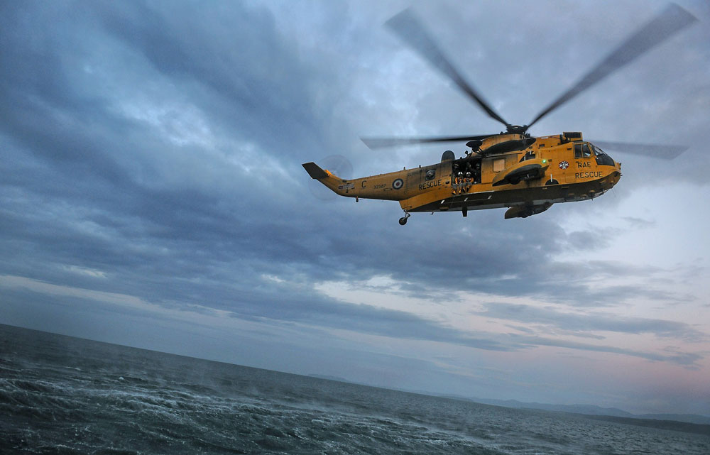 A Royal Air Force Sea King Search and Rescue helicopter from 203 Squadron RAF is pictured during Exercise Yellow Scorpion with the RNLI (Royal National Lifeboat Institute). The helicopter was piloted by newly qualified SAR pilot HRH Prince William.