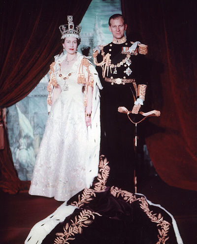 The Coronation ceremony took place on June 2nd 1953 in Westminster Abbey and was televised for the first time. Elizabeth's coronation gown was commissioned from Norman Hartnell and embroidered on her instructions with the floral emblems of Commonwealth countries: English Tudor rose; Scots thistle; Welsh leek; Irish shamrock; Australian wattle; Canadian maple leaf; New Zealand silver fern; South African protea; lotus flowers for India and Ceylon; and Pakistan's wheat, cotton, and jute.