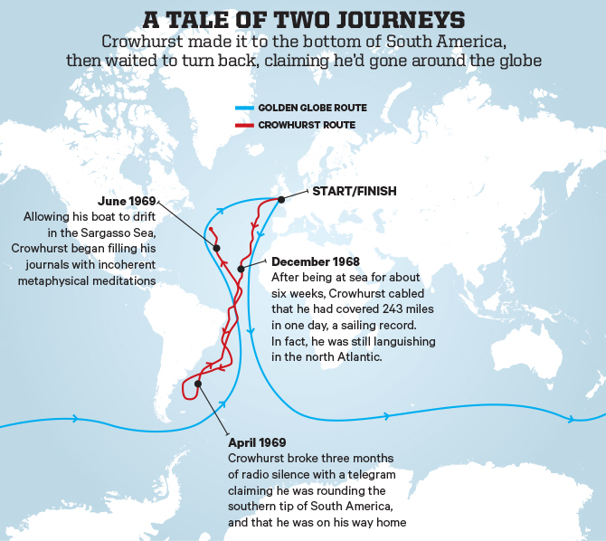 On October 31, 1968, Donald Crowhurst, a 36-year-old father of four, sailed out of Teignmouth on his 40-foot trimaran, Teignmouth Electron. He had entered the Sunday Times Golden Globe Race to gain publicity for his failing electronics business, believing he could become a seafaring hero like Chichester and win the race to be the first person to sail solo non-stop around the globe. Very early into his voyage he logged: "this bloody boat is just falling to pieces!!!" And so his great deception began, falsifying his position while languishing in the North Atlantic.