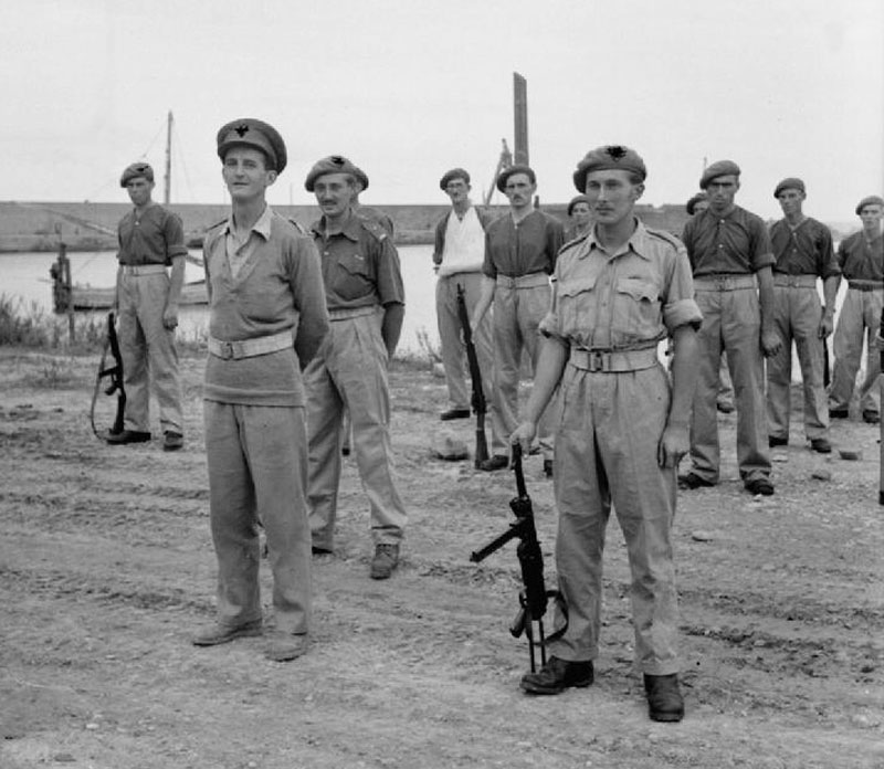 Members of 2 SAS on parade for an inspection by General Montgomery, following their successful participation in the capture, behind enemy lines, of the port of Termoli in Italy. On the left is Major E Scratchley DSO, MC, commanding the SAS detachment. Additional: On the right is Captain Roy Farran holding a German Schmeisser sub-machine-gun