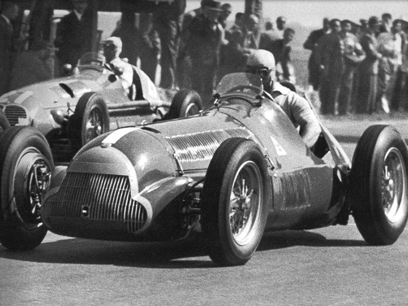 Juan Manuel Fangio in an Alfa Romeo at the start of the 1950 British GP