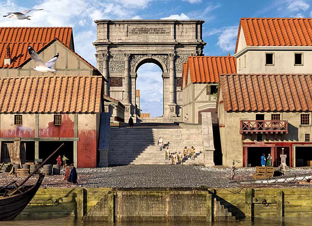A reconstruction of the Richborough triumphal arch as it may have looked from the waterfront in about AD 120.