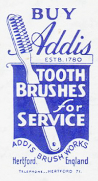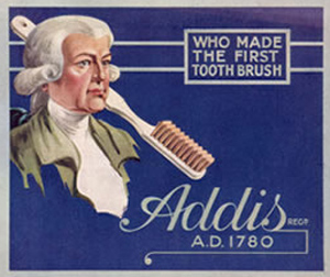 In 1770, Addis had been jailed for causing a riot. While in prison he decided that the method used to clean teeth at the time was ineffective. To that end, he saved a small animal bone left over from the meal he had eaten the previous night, into which he drilled small holes. He then obtained some bristles from one of his guards, which he tied in tufts that he then passed through the holes in the bone, and which he finally sealed with glue.