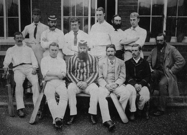 Gloucestershire County Cricket Club in 1880 shortly before Fred Grace's untimely death. W. G. Grace is seated front left centre. Fred (hooped cap) is third left in rear group. Billy Midwinter (directly behind W. G.) is fourth left in rear. E. M. Grace (bearded) is sixth left in rear.