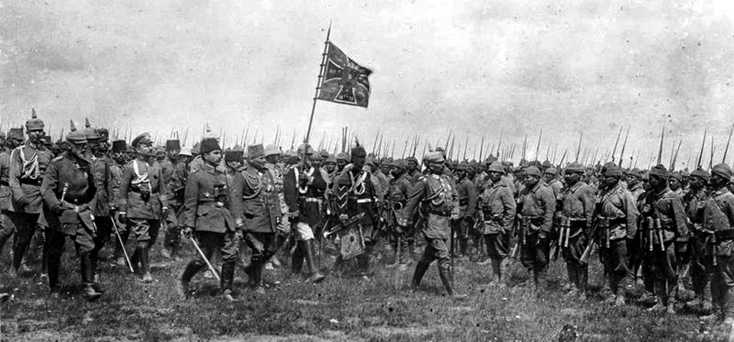 Kaiser Wilhelm II inspecting Turkish troops of the 15th Corps in East Galicia, Austria-Hungary (now Poland). Prince Leopold of Bavaria, the Supreme Commander of the German Army on the Eastern Front, is second from the left.