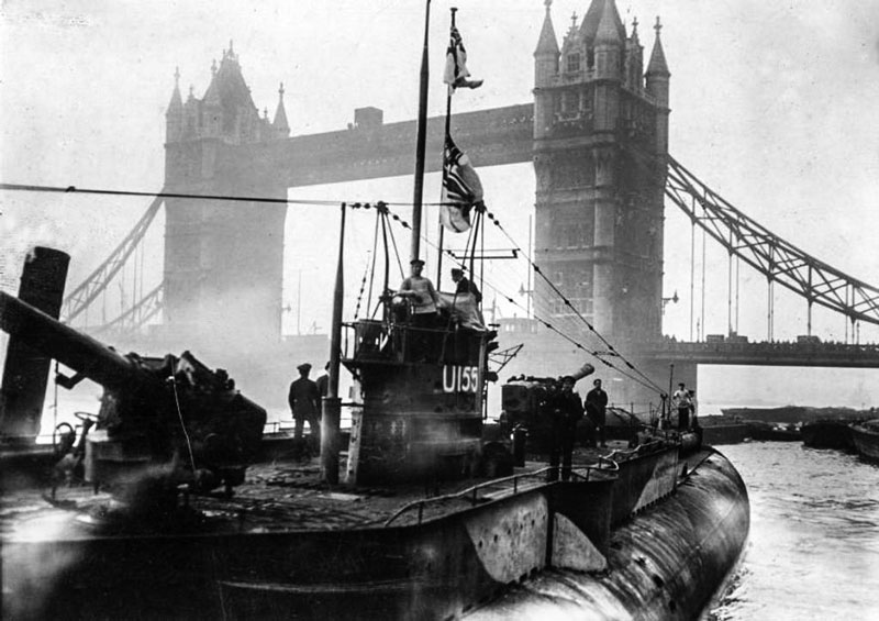 U-155 exhibited near Tower Bridge, after the 1918 Armistice