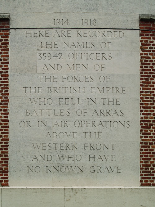 Designed by Sir Edwin Lutyens, the memorial includes sculpture by Sir William Reid Dick. Located in the same cemetery is the Arras Flying Services Memorial (commemorating 991 airmen with no known grave).