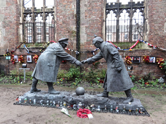 The sculpture 'All Together Now', designed by Andy Edwards, on display at St Luke's bombed out church in Liverpool. It represents the moment British and German soldiers stopped fighting to play a game of football on Christmas Day 1914.