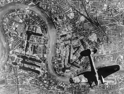 A German Heinkel He 111 bomber flying over the East End of London during the Blitz.