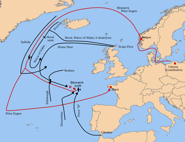 Map of Operation "Rheinübung" and Royal Navy operations against the battleship Bismarck