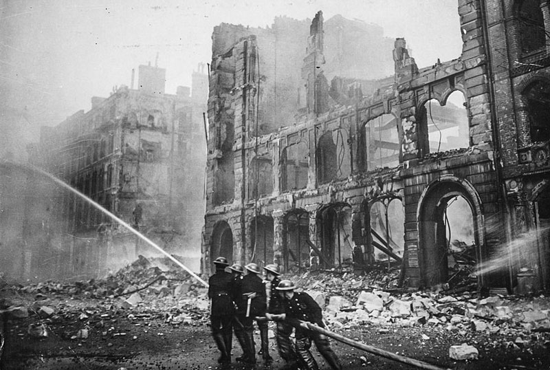Firefighters tackling a blaze amongst ruined buildings after an air raid on London.