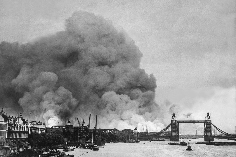 Smoke rising from fires in the London docks after bombing on 7th September 1940.