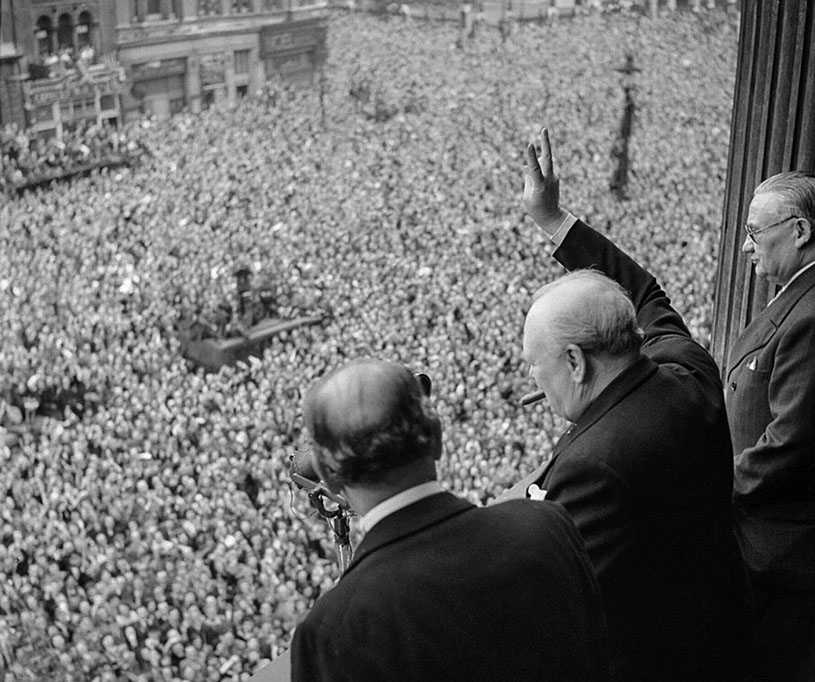 Winston Churchill waves to crowds in Whitehall in London as they celebrate VE Day.